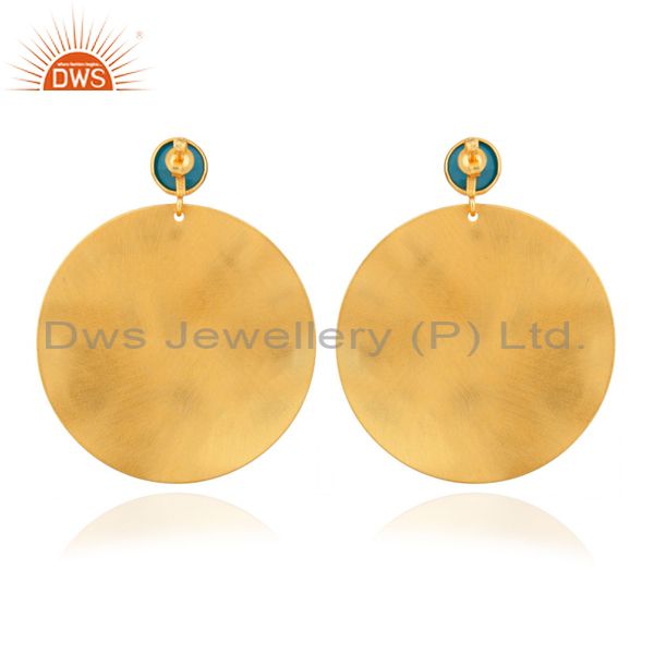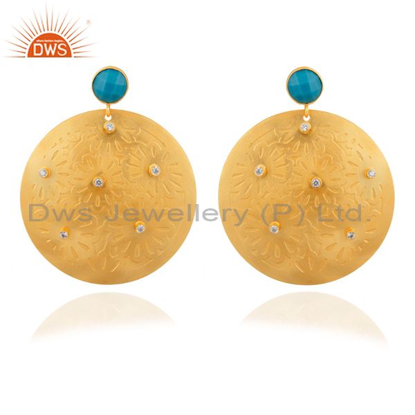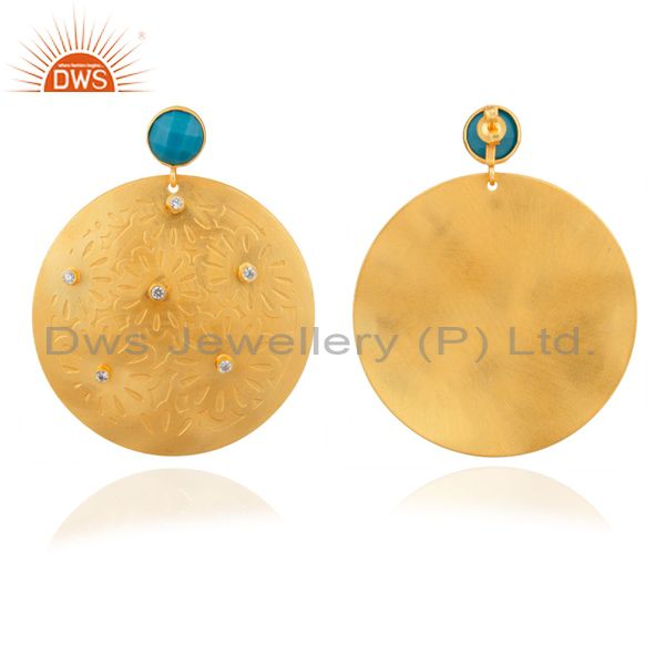 Handmade Turquoise And Cz 22K Yellow Gold Plated Brass Disc Dangle Earrings