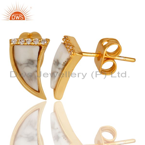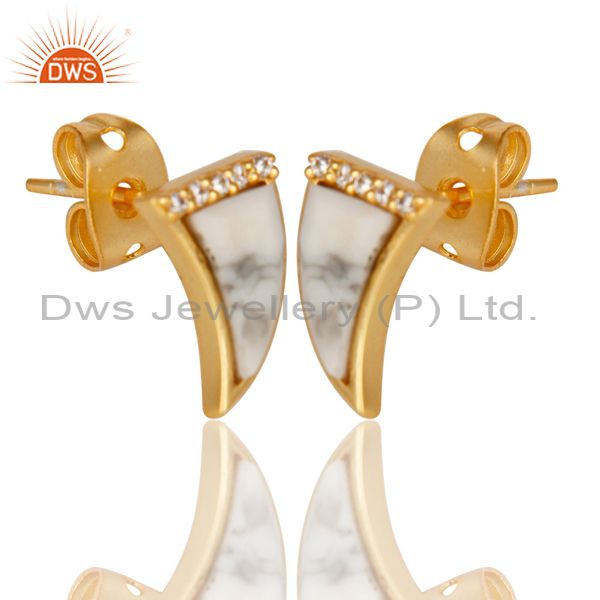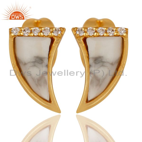 Howlite Tiny Horn Cz Studded Post Gold Plated Sterling Silver Earring