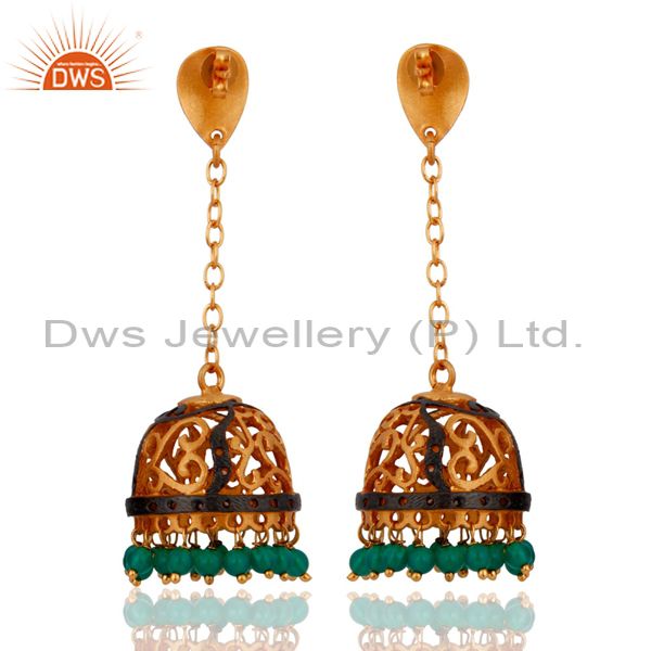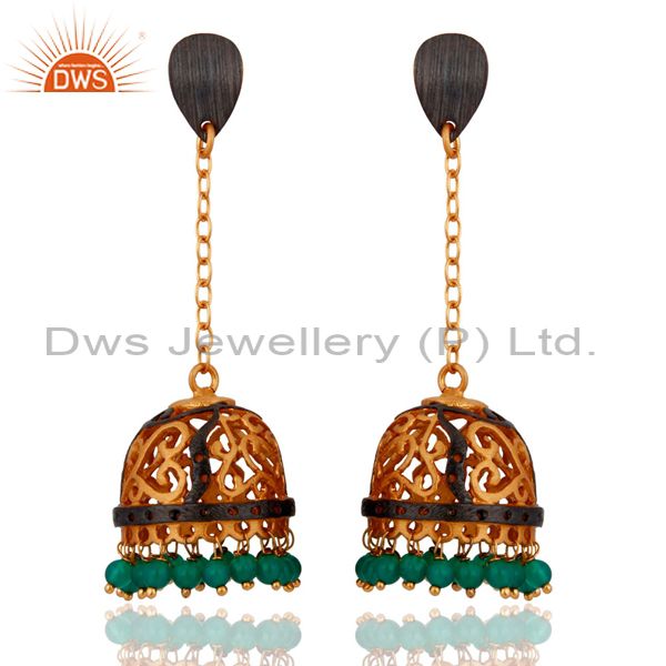 Indian Filigree Designer 22K Gold Plated Green Onyx Gemstone Long Jhumka Earring