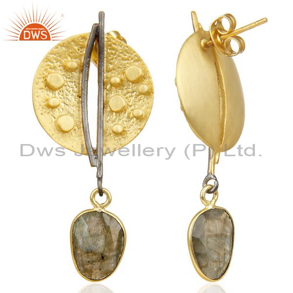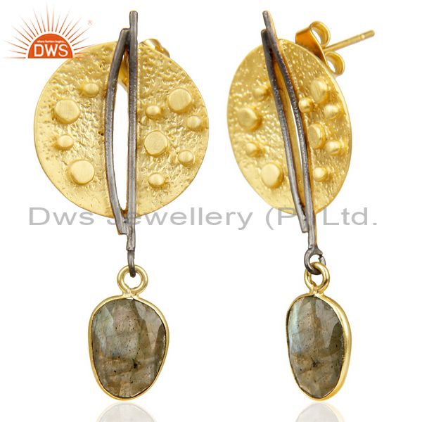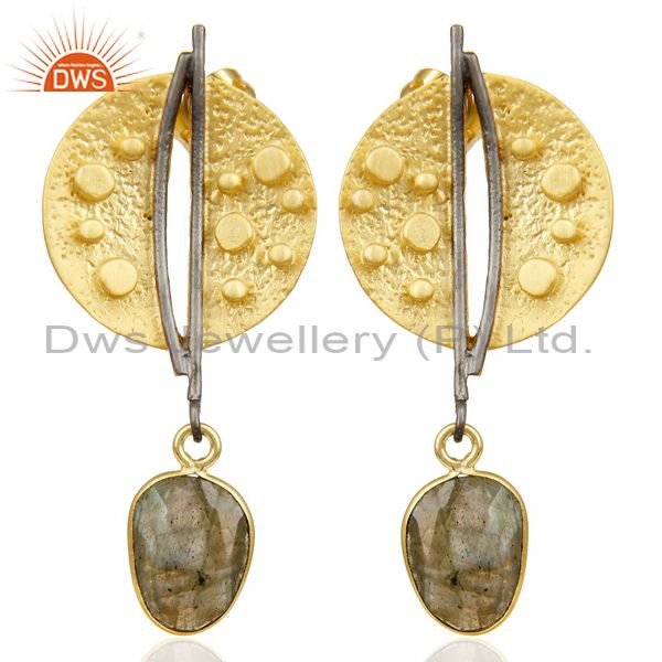 Labradorite Dangle 14K Yellow Gold Plated Textured Design Brass Earrings Jewelry