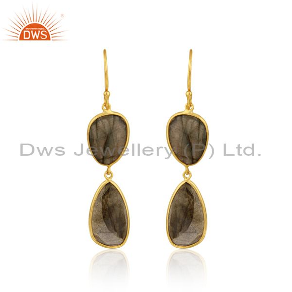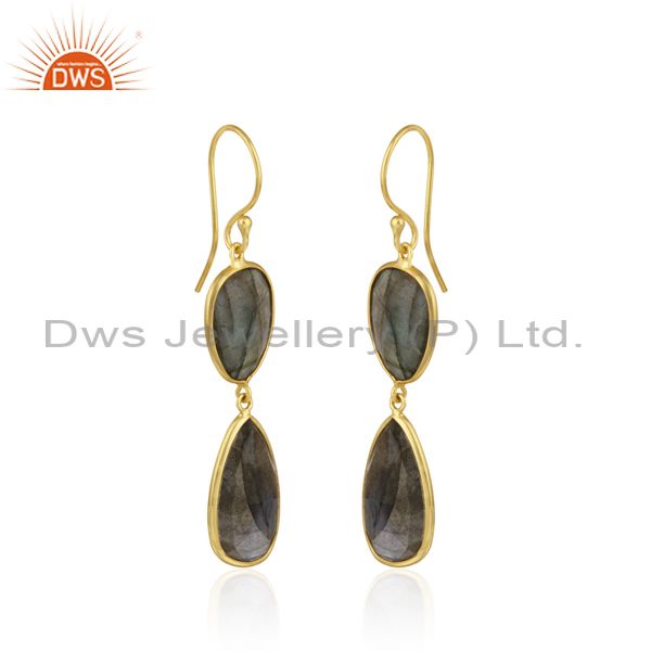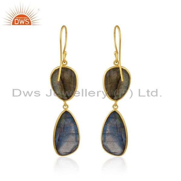 Labradorite Double Drop Dangle Earring in Yellow Gold On Silver