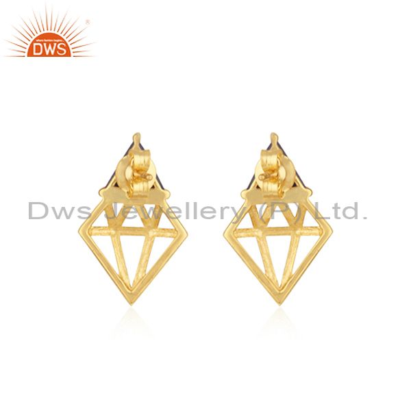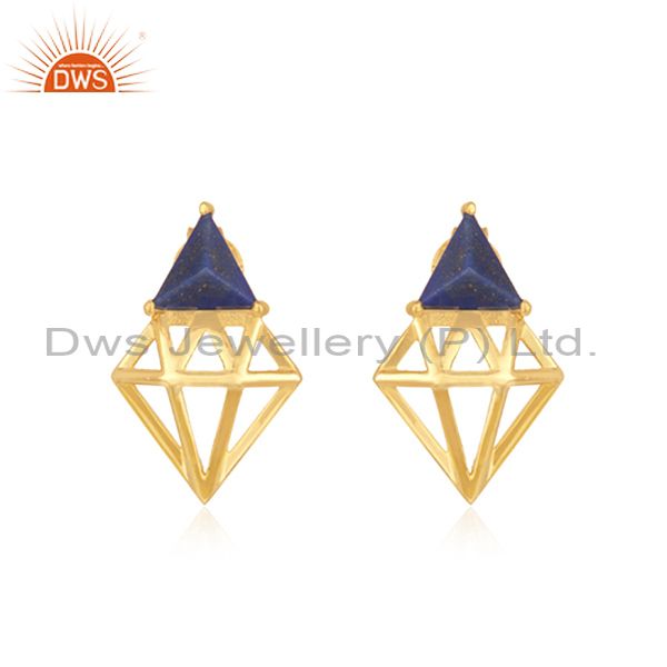 Lapis Lazuli Gemstone 925 Silver Gold Plated Diamond Shape Stud Earrings