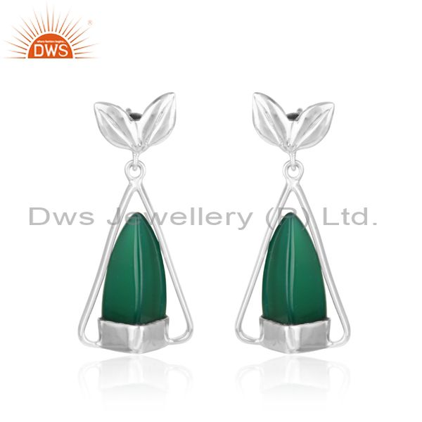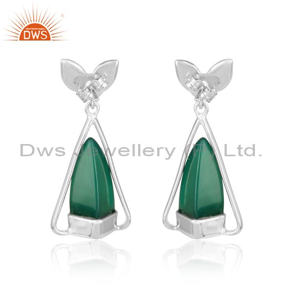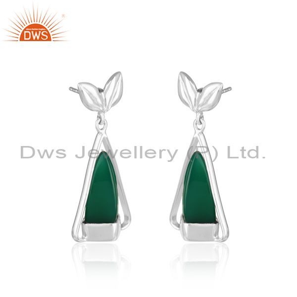 Leaf Design Dangle in Rhodium on Silver and Fancy Green Onyx