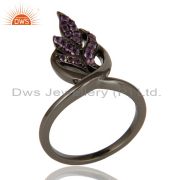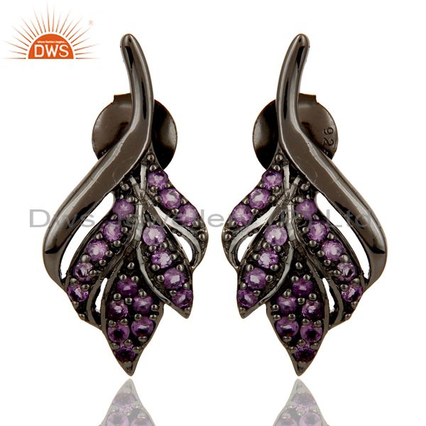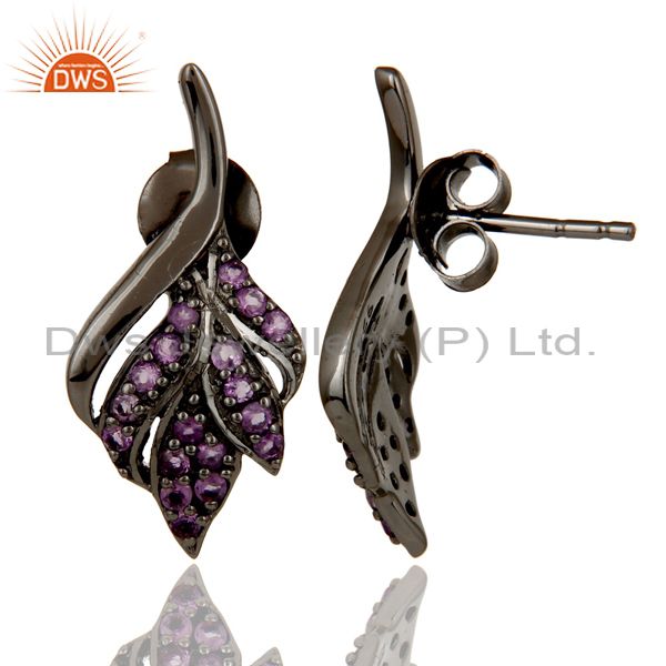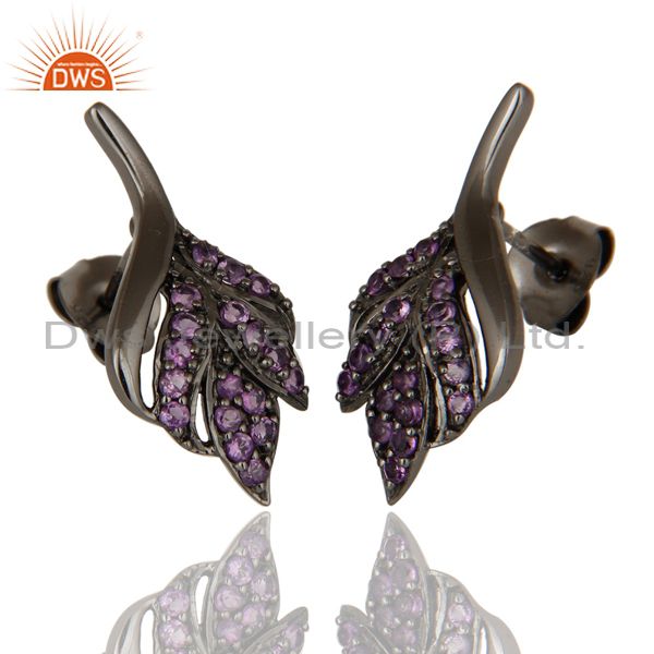 Leaf Rame Design Amethyst and Oxidized Sterling Silver Stud Earring