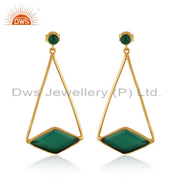 Long Dangle Earring In Yellow Gold on Silver 925 with Green Onyx