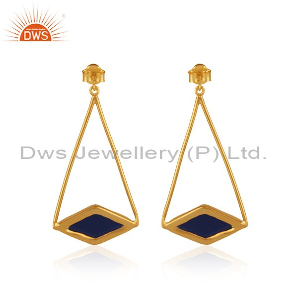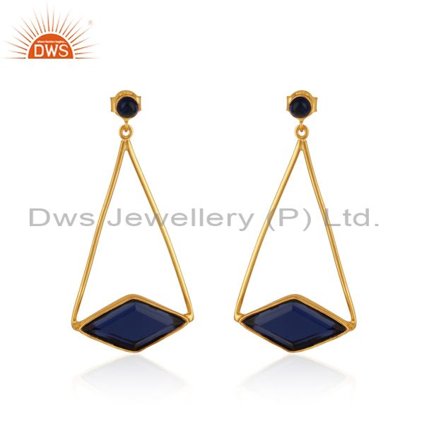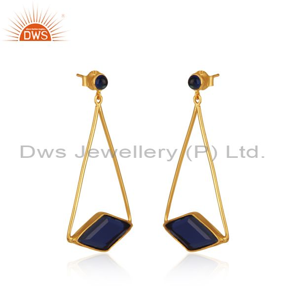 Long Dangle Earring In Yellow Gold on Silver with Blue Corundum