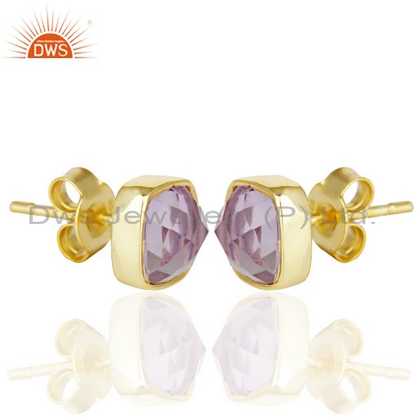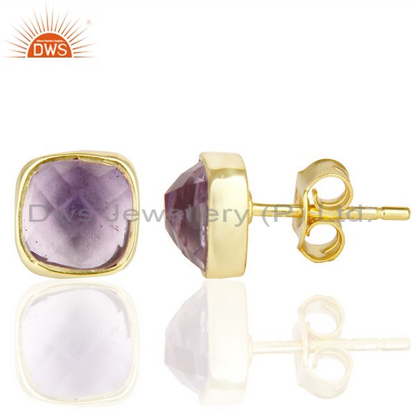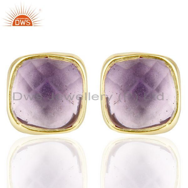 Natural Amethyst Cushion Rose Cut Small 14 K Gold Plated Stud Earring