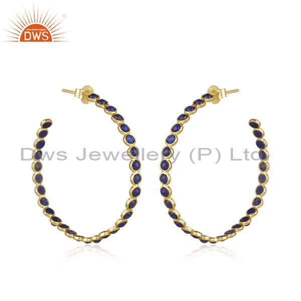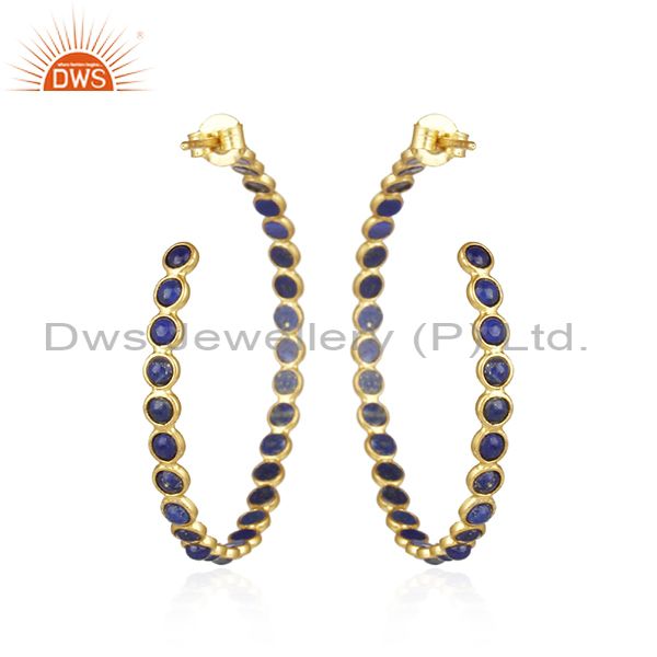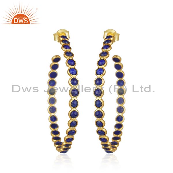 Natural Lapis Gemstone Yellow Gold Plated Silver Hoop Earrings Jewelry