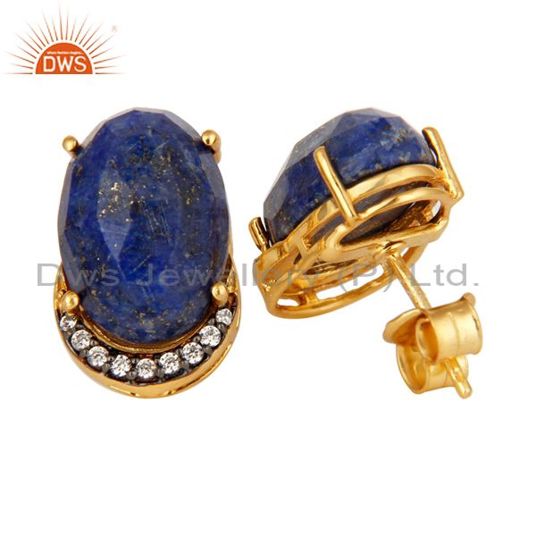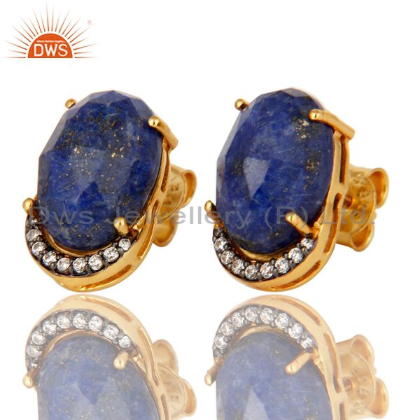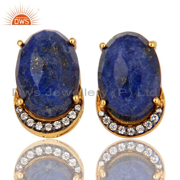 Natural Lapis Lazuli Gemstone And Cz Sterling Silver Stud Earrings - Gold Plated