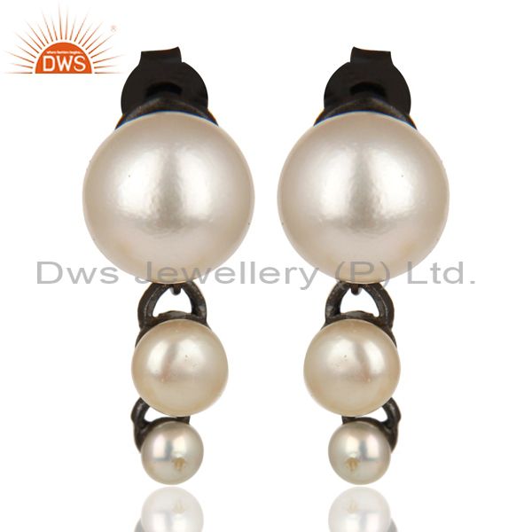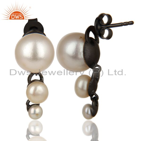Natural Pearl Stud Black Oxidized 925 Sterling Silver Earrings Jewelry
