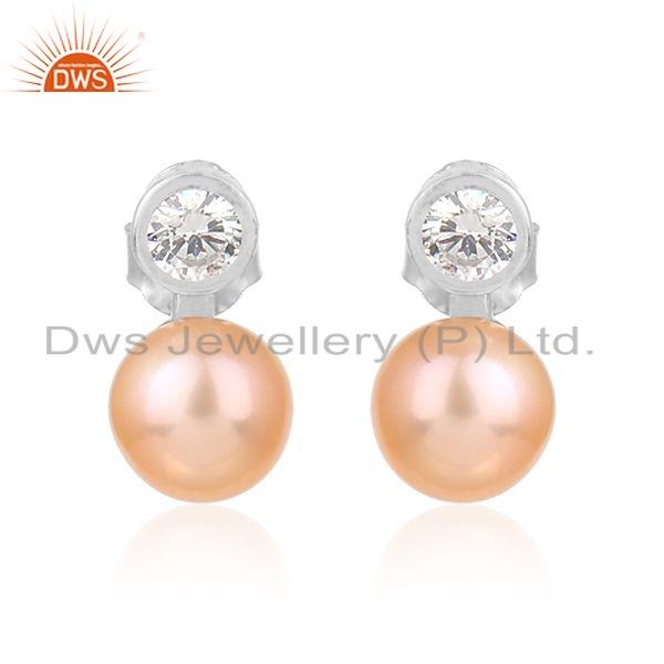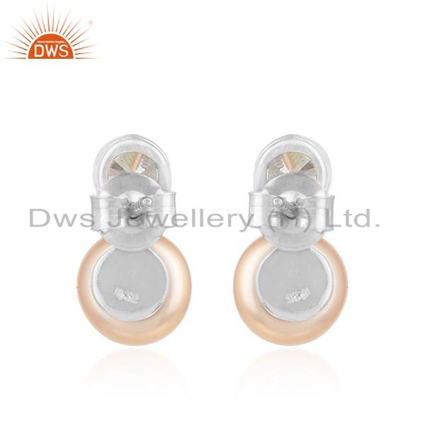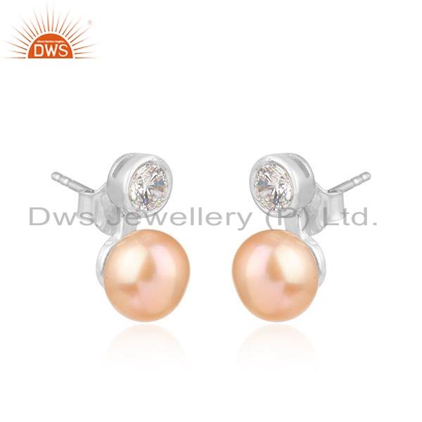 Natural Pink Pearl Gemstone Rhodium Plated Silver Stud Earrings