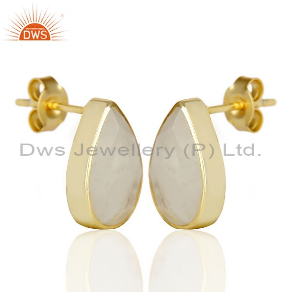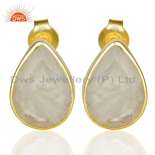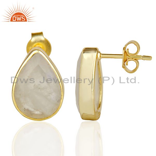 Natural Rainbow Moon Stone Pear Shape Flat Back Gold Plated Stud Earring