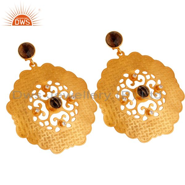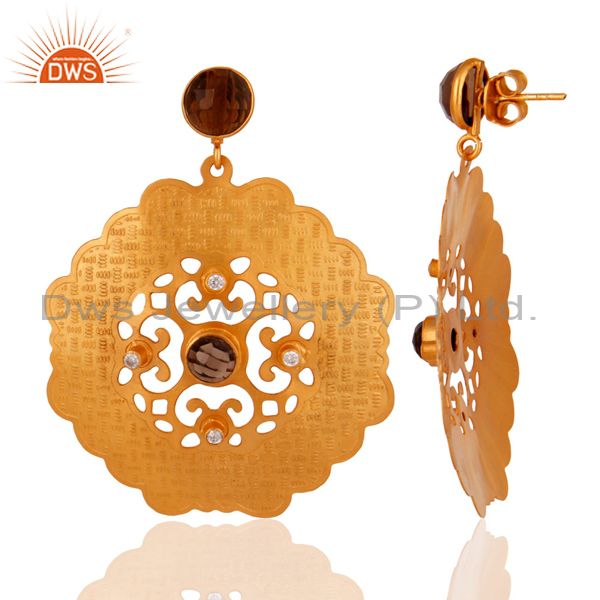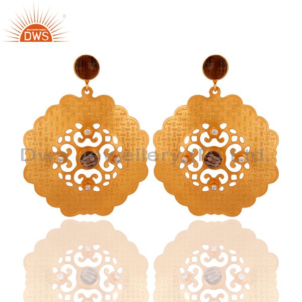 Natural Smoky Quartz & White Zircon Handmade Designer 22K Gold Plated Earrings