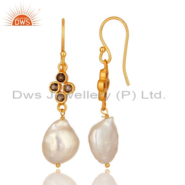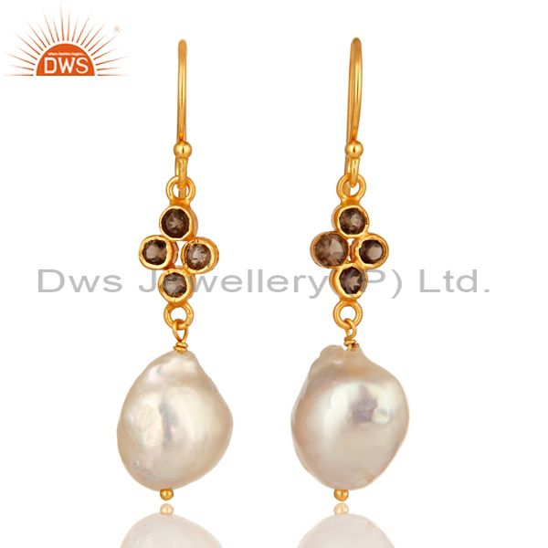 Natural Smoky Quartz And Pearl Dangle Earrings Made In 18K Gold Over Silver