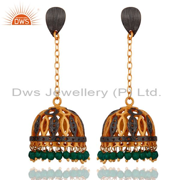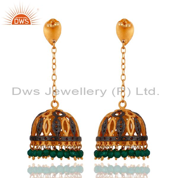 New 18K Yellow Gold Plated Green Onyx Gemstone Filigree Designer Dangle Earrings