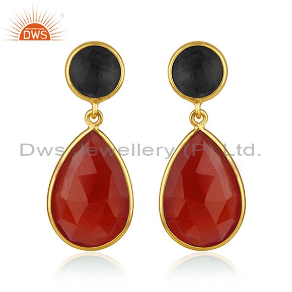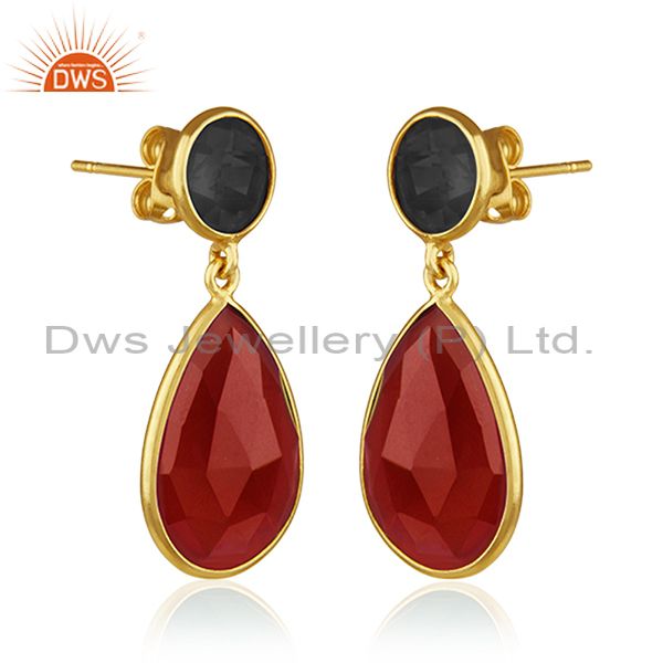 Onyx Red And Corundum Blue Gold Plated Brass Fashion Gemstone Earring Wholesaler