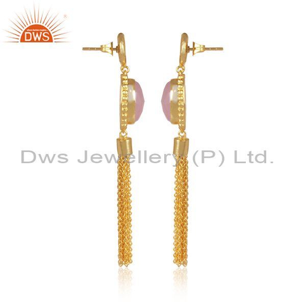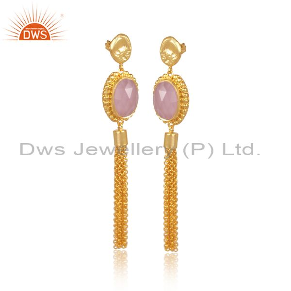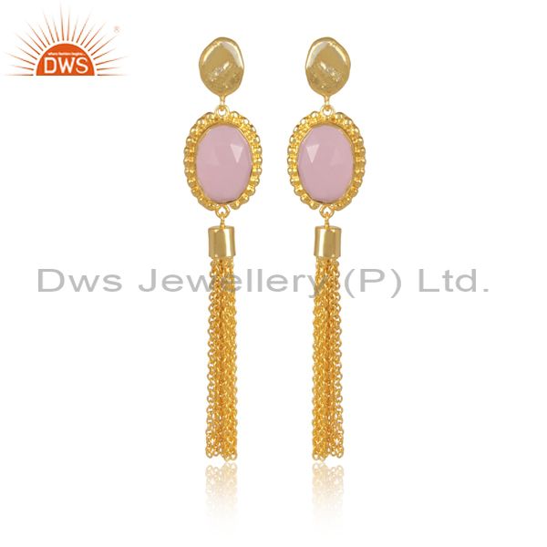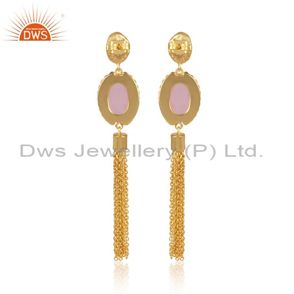 Oval Cut Glass Rose Set Classy Long Drop Brass Gold Earrings
