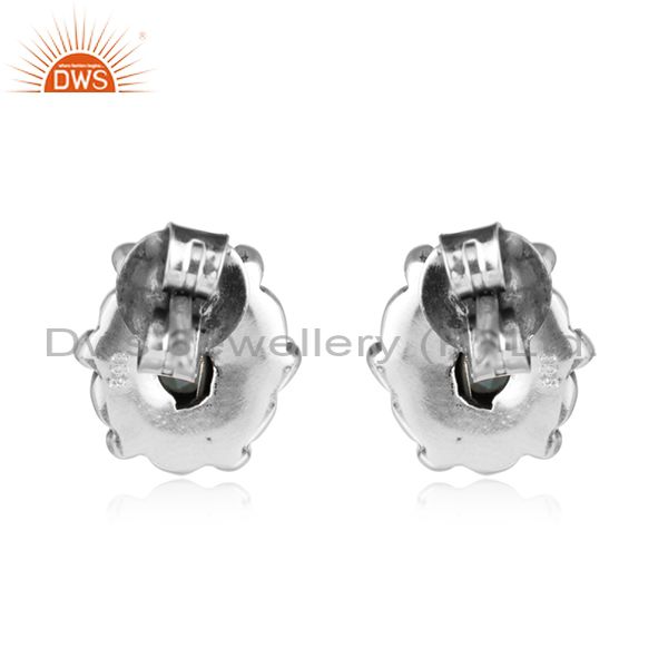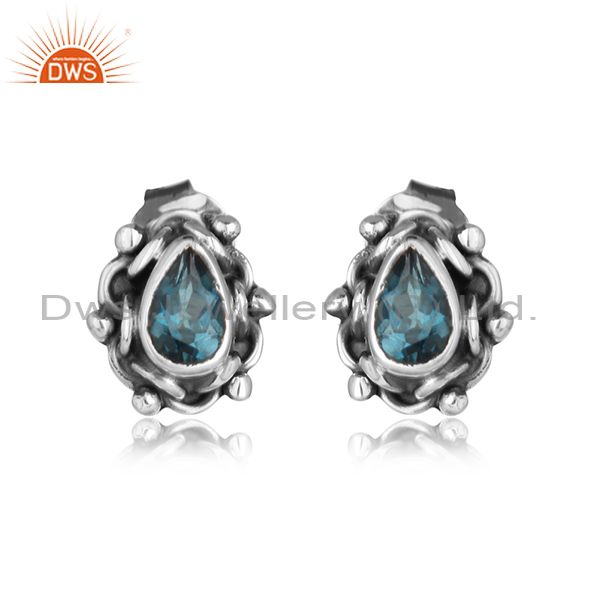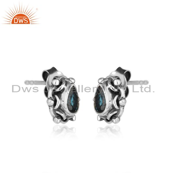 Oxidized 925 Silver Tiny Blue Topaz Gemstone Designer Stud Earring