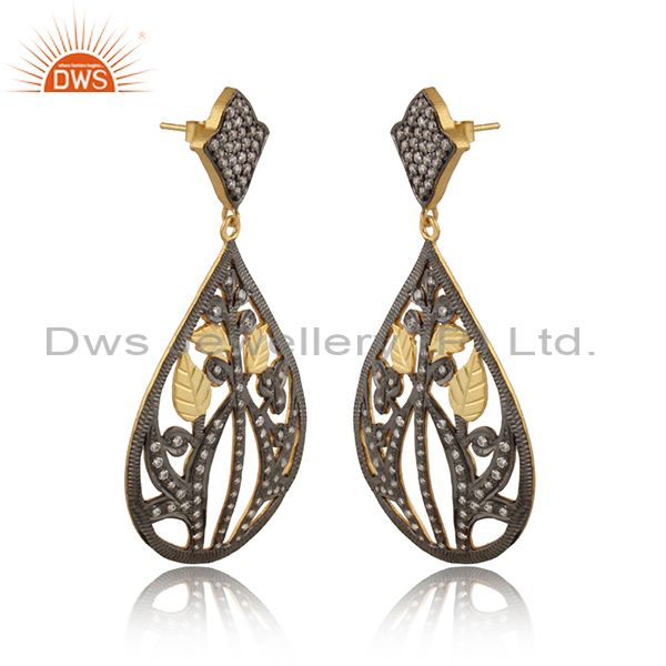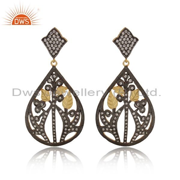 Oxidized And 18K Gold Plated Sterling Silver Cz Leaf Design Dangle Earrings