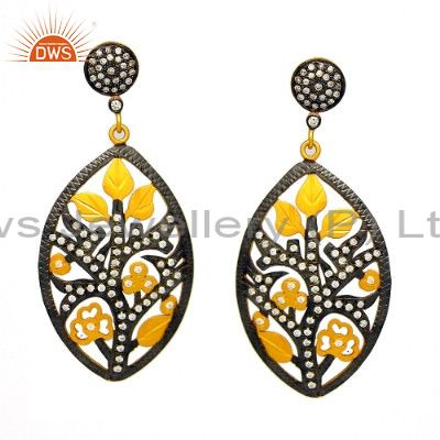 Oxidized And 18K Gold Plated Sterling Silver Floral Designer Earrings With Cz