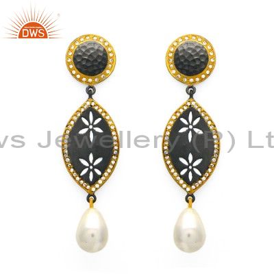 Oxidized And 18K Gold Plated Sterling Silver Pearl & Cz Fashion Dangle Earrings