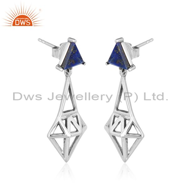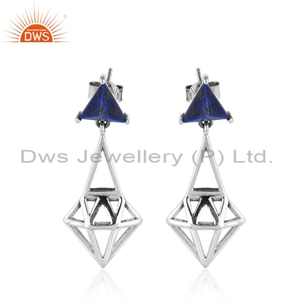 Oxidized Silver Diamond Shape Natural Lapis Gemstone Earrings Jewelry