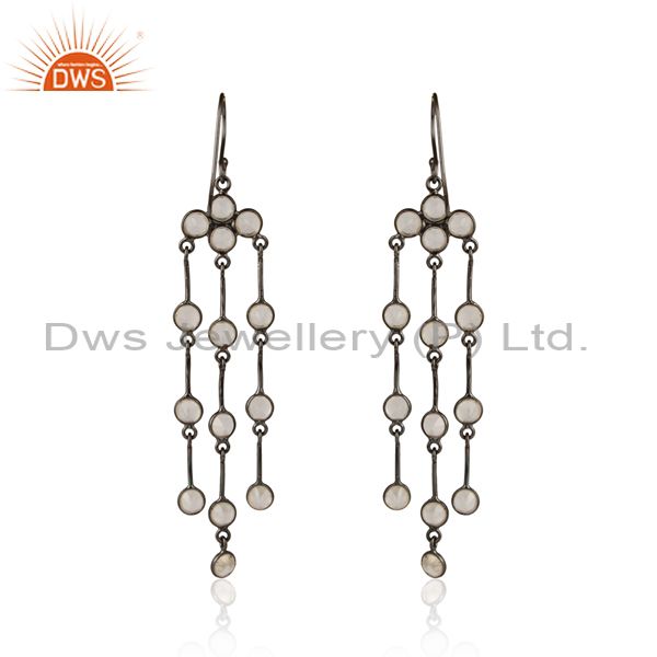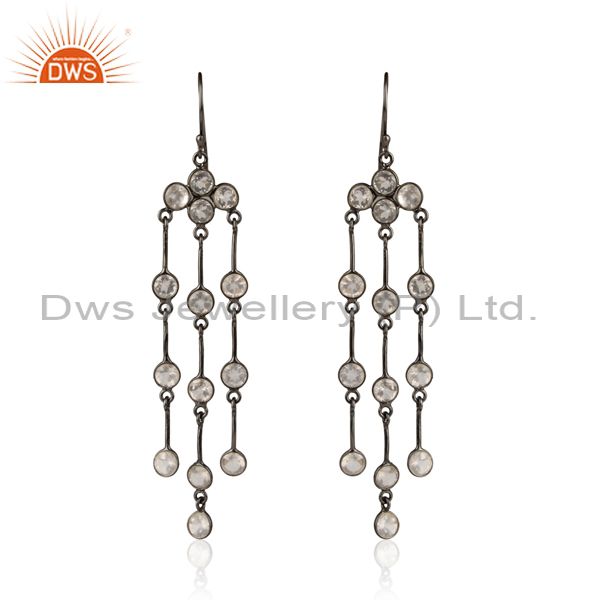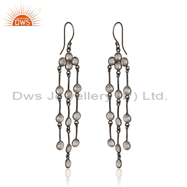 Oxidized Solid Sterling Silver Rose Quartz Gemstone Chain Chandelier Earrings