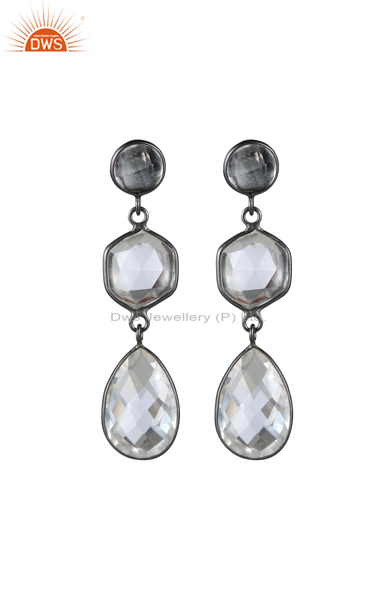 Oxidized Solid Sterling Silver Triple Crystal Quartz Bezel Set Drop Earrings