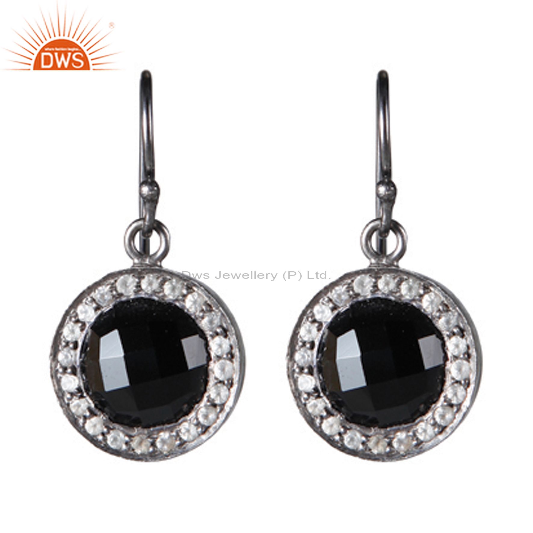Oxidized Sterling Silver Black Onyx And White Topaz Halo Style Dangle Earrings