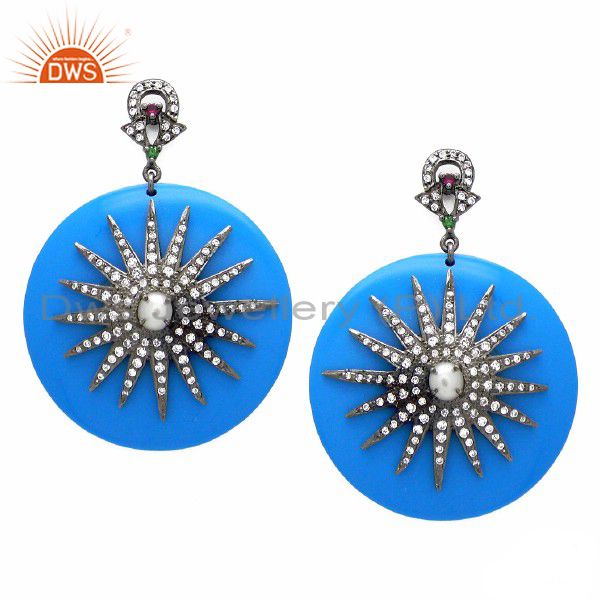 Oxidized Sterling Silver Blue Bakelite And Cz Designer Vintage Dangle Earrings
