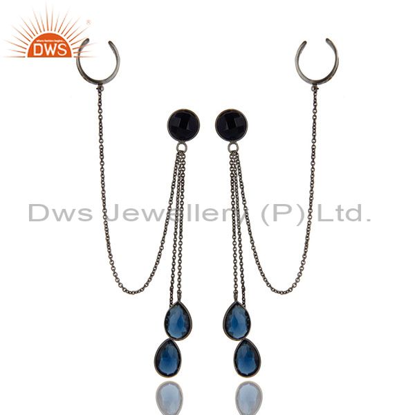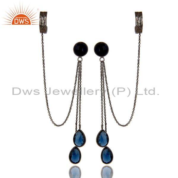 Oxidized Sterling Silver Blue Corundum Gemstone Chain Fashion Ear Cuff Earrings