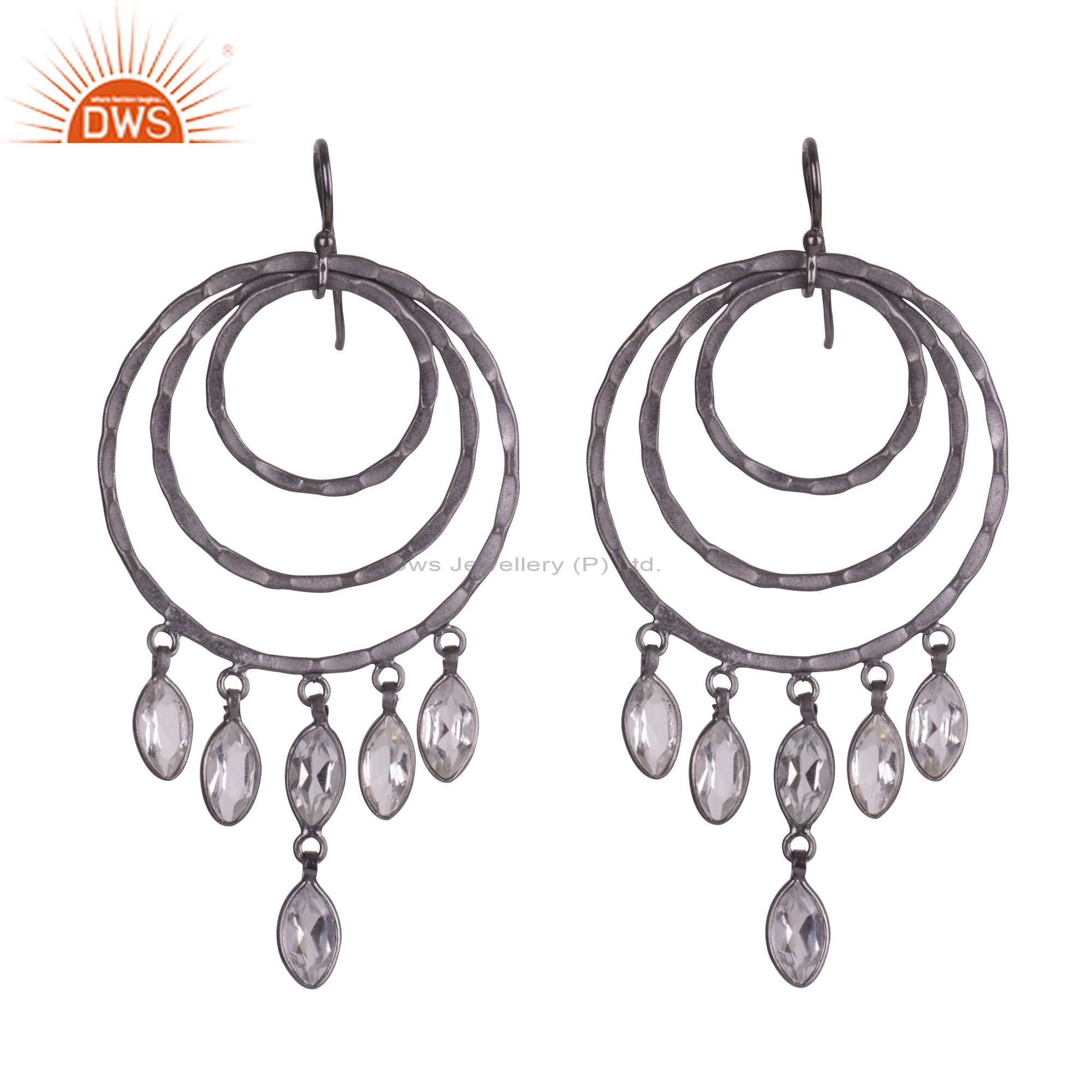 Oxidized Sterling Silver Crystal Quartz Hammered Multi Circle Chandelier Earring