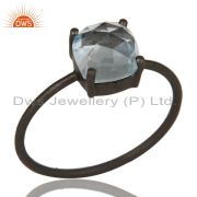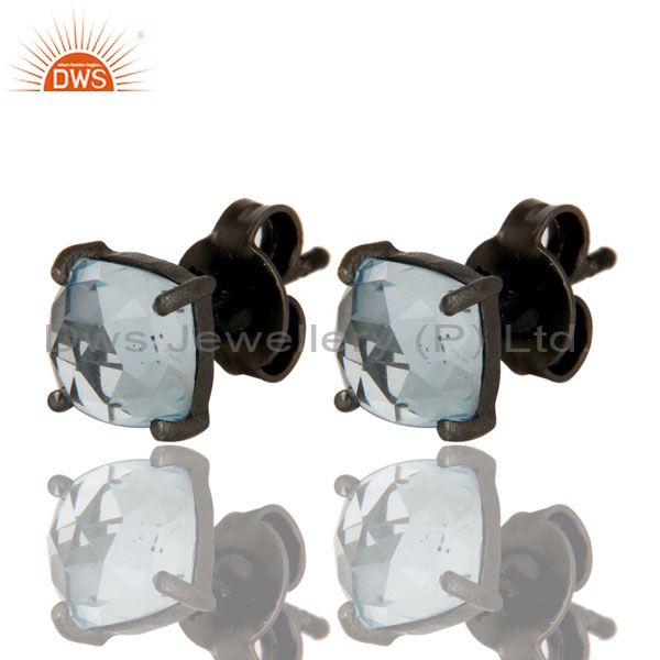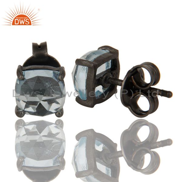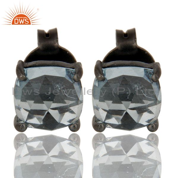 Oxidized Sterling Silver Cushion Cut Blue Topaz Prong Set Womens Stud Earrings