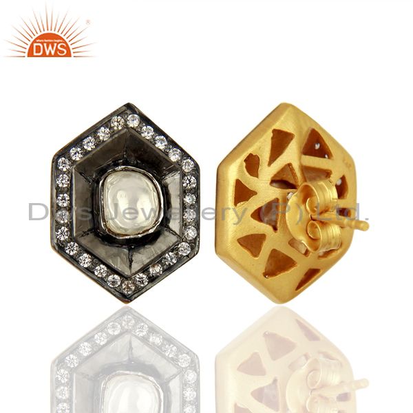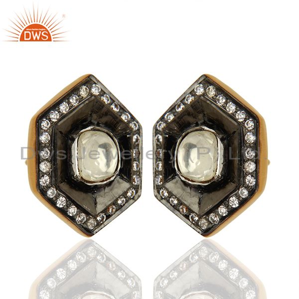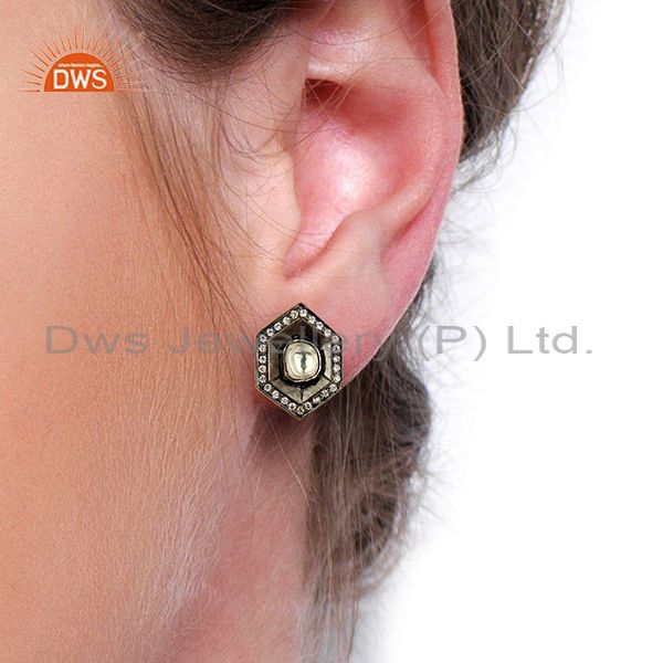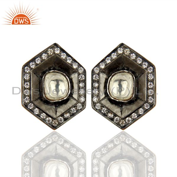 Oxidized Sterling Silver Cz Crystal Polki Antique Look Ladies Stud Earrings