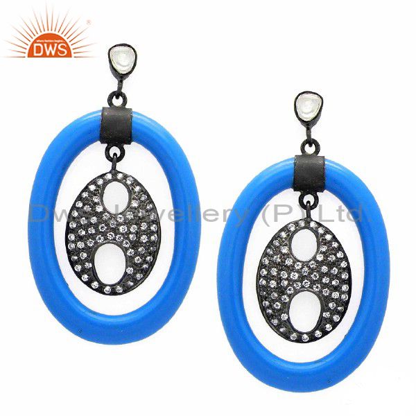 Oxidized Sterling Silver Cz Crystal Polki Bakelite Vintage Style Dangle Earrings