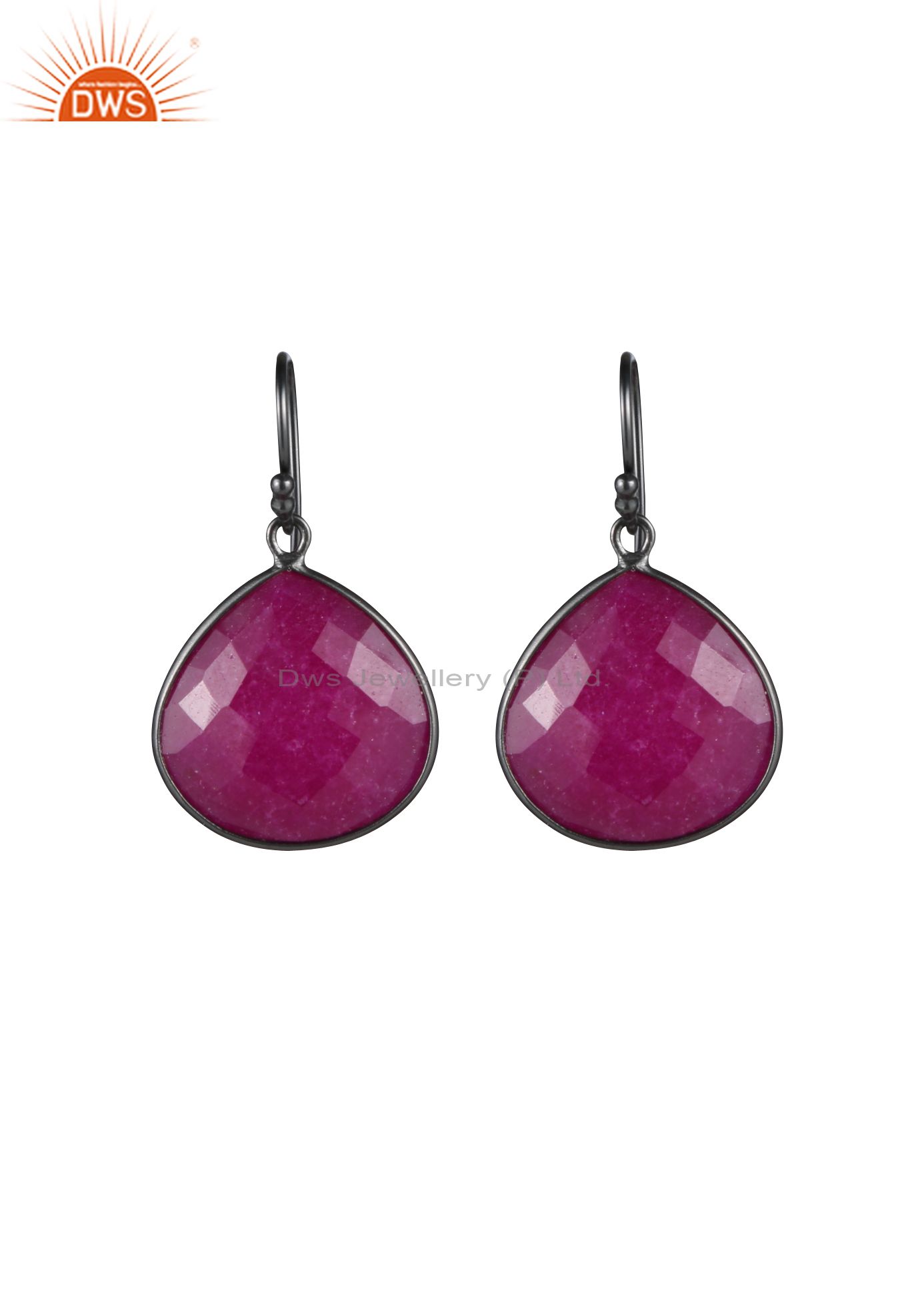 Oxidized Sterling Silver Dyed Ruby Gemstone Bezel Set Drop Earrings