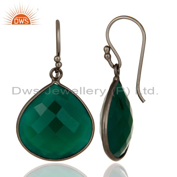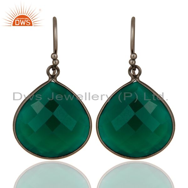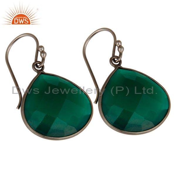 Oxidized Sterling Silver Faceted Green Onyx Bezel Set Gemstone Drop Earrings