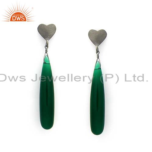 Oxidized Sterling Silver Green Onyx Gemstone Smooth Dangle Heart Earrings