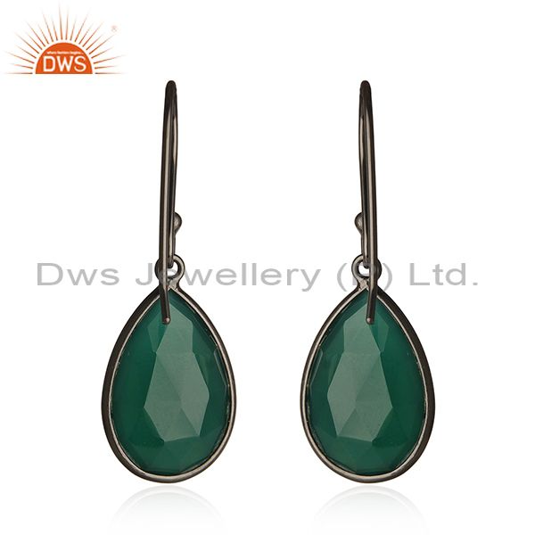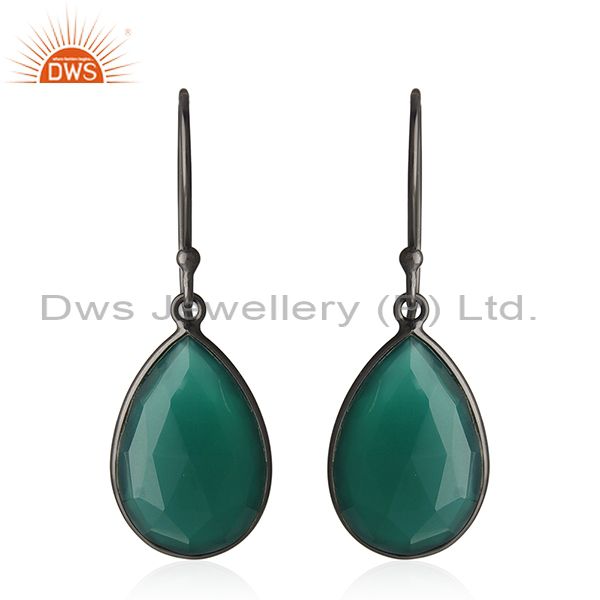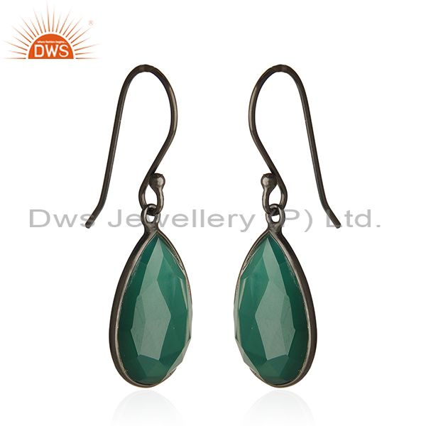 Oxidized Sterling Silver Natural Green Onyx Gemstone Bezel Set Dangle Earrings