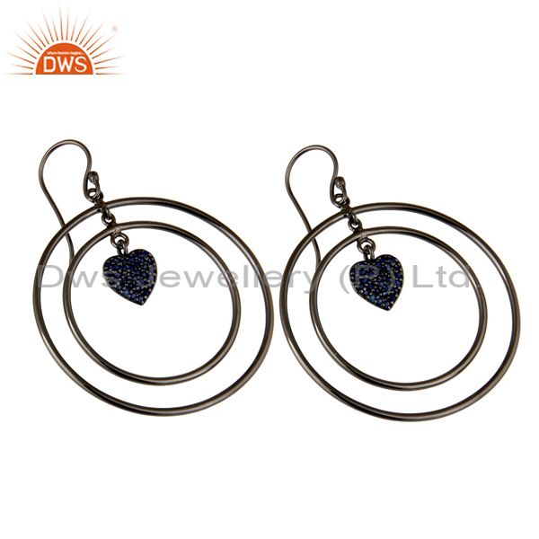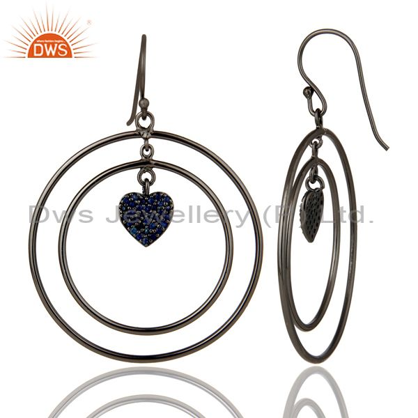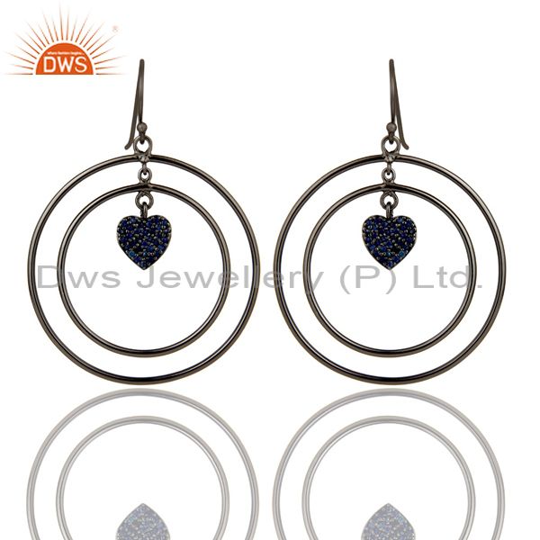 Oxidized Sterling Silver Pave Blue Sapphire Heart Design Circle Dangle Earrings