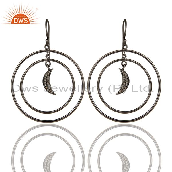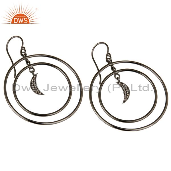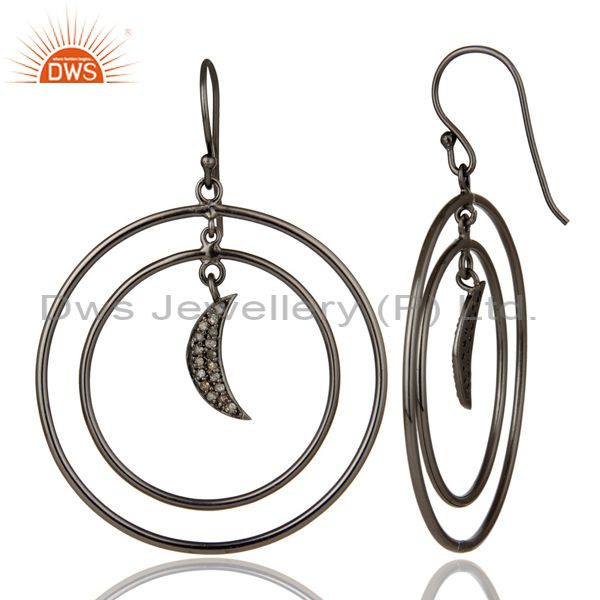 Oxidized Sterling Silver Pave Diamond Half Moon Charm Circle Dangle Earrings