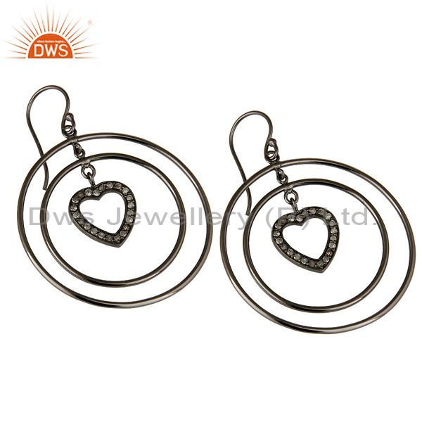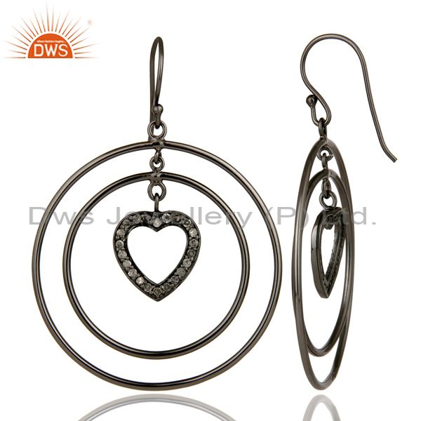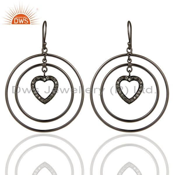 Oxidized Sterling Silver Pave Set Diamond Heart Design Circle Dangle Earrings