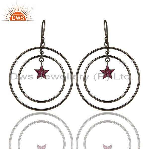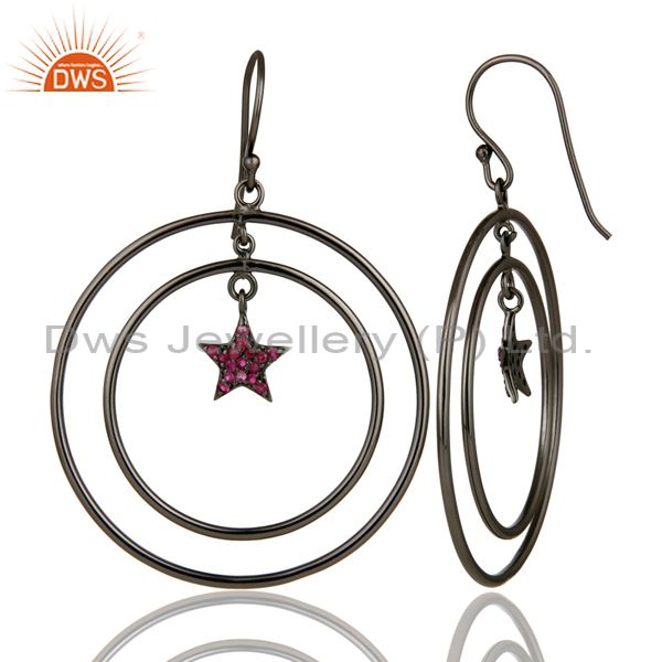 Oxidized Sterling Silver Pave Set Ruby Star Design Multi Circle Dangle Earrings