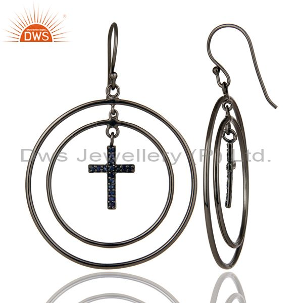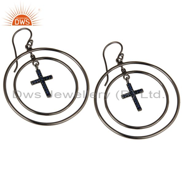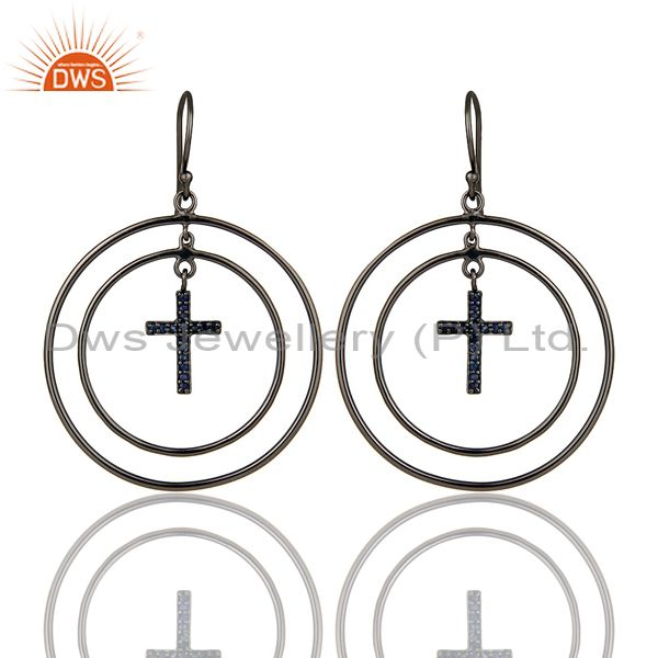 Oxidized Sterling Silver Pave Setting Blue Sapphire Cross Circle Dangle Earrings
