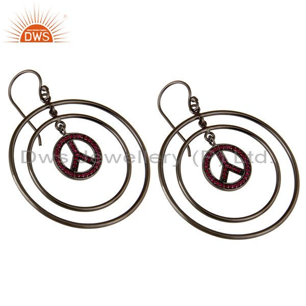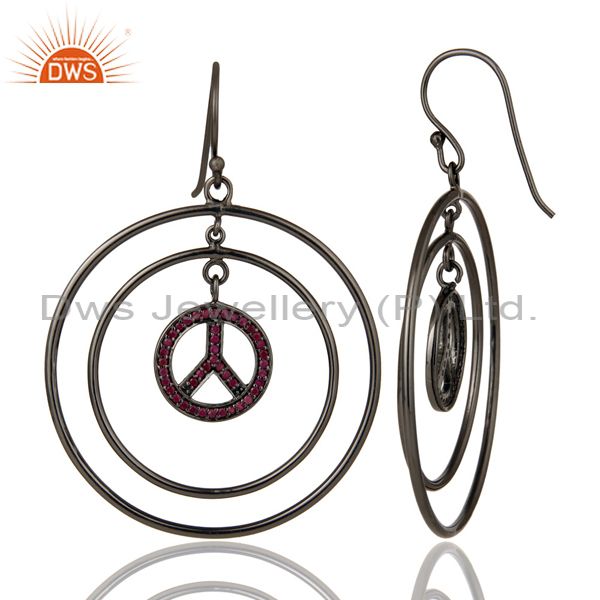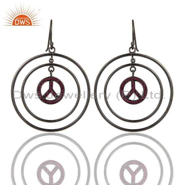 Oxidized Sterling Silver Pave Setting Ruby Peace Sign Birthstone Dangle Earrings
