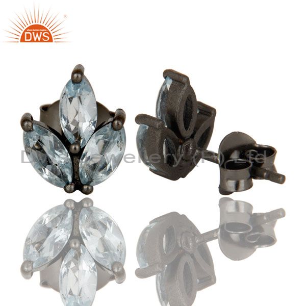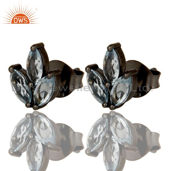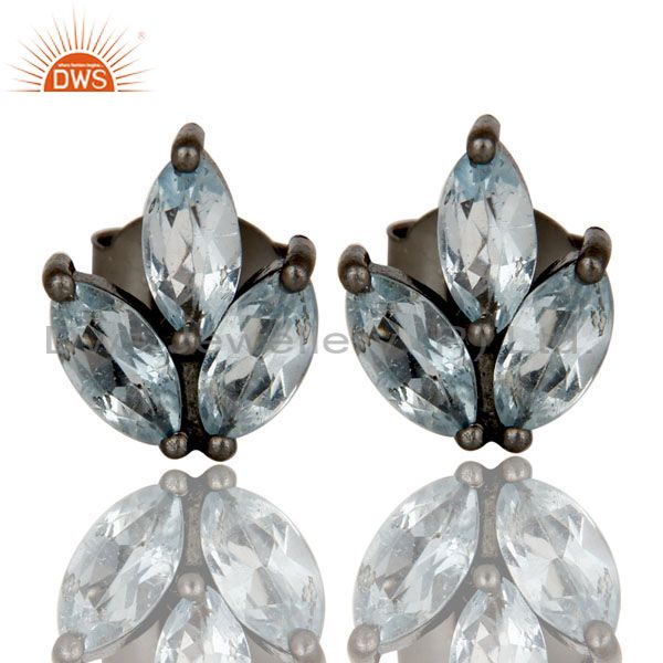 Oxidized Sterling Silver Prong Set Blue Topaz Gemstone Stud Earrings