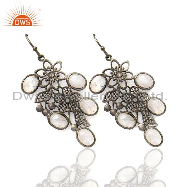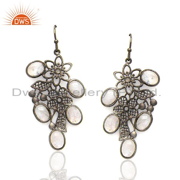 Oxidized Sterling Silver Rainbow Moonstone Designer Fashion Dangle Earrings