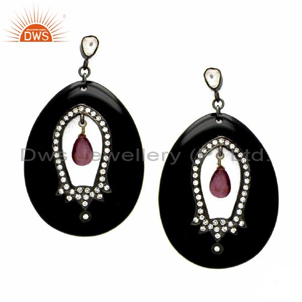 Oxidized Sterling Silver Tourmaline Cz Polki Bakelite Vintage Style Earrings
