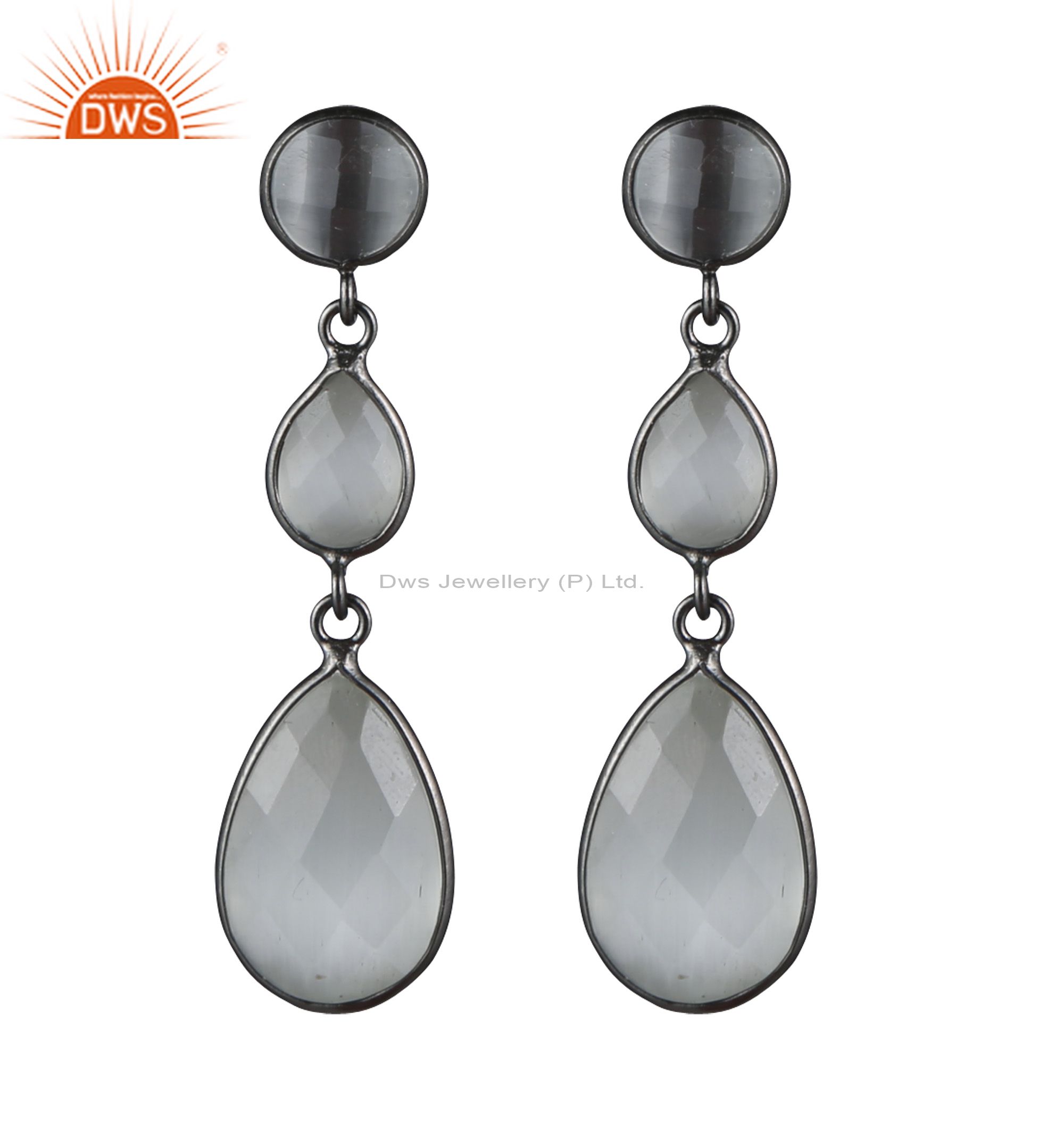 Oxidized Sterling Silver White Moonstone Bezel Setting Dangle Earrings