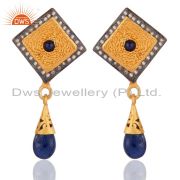 Pave Diamond Blue Sapphire Gemstone Stud Earring Made In 18K Gold Over Sterling